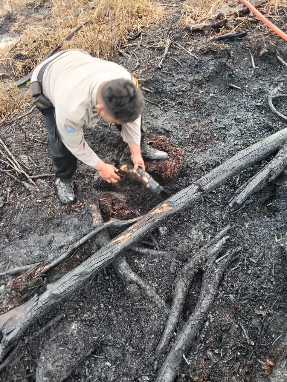 Petugas kemudian mendekati dan mengamankan pria tersebut. Dari hasil interogasi di lokasi, terduga pelaku berinisial E.S. alias WB (54) mengakui telah membakar lahan miliknya dengan menggunakan mancis dan karet ban pada beberapa titik dengan tujuan membersihkan lahan yang akan ditanami kelapa sawit.